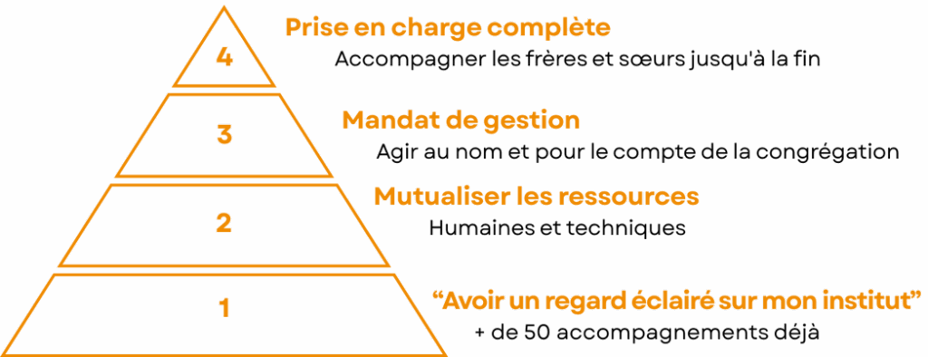Sur les questions de gouvernance, CORREF & CIE doit réfléchir avec les congrégations à de nouvelles propositions, c’est l’objet des travaux de la matinée. Le mandat de gestion viendrait alors compléter la pyramide des services proposés.