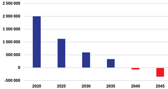Les réserves financières sur 25 ans. Ce graphique montre à quel moment les réserves baissent fortement, pour aider les responsables à décider quand et comment agir.